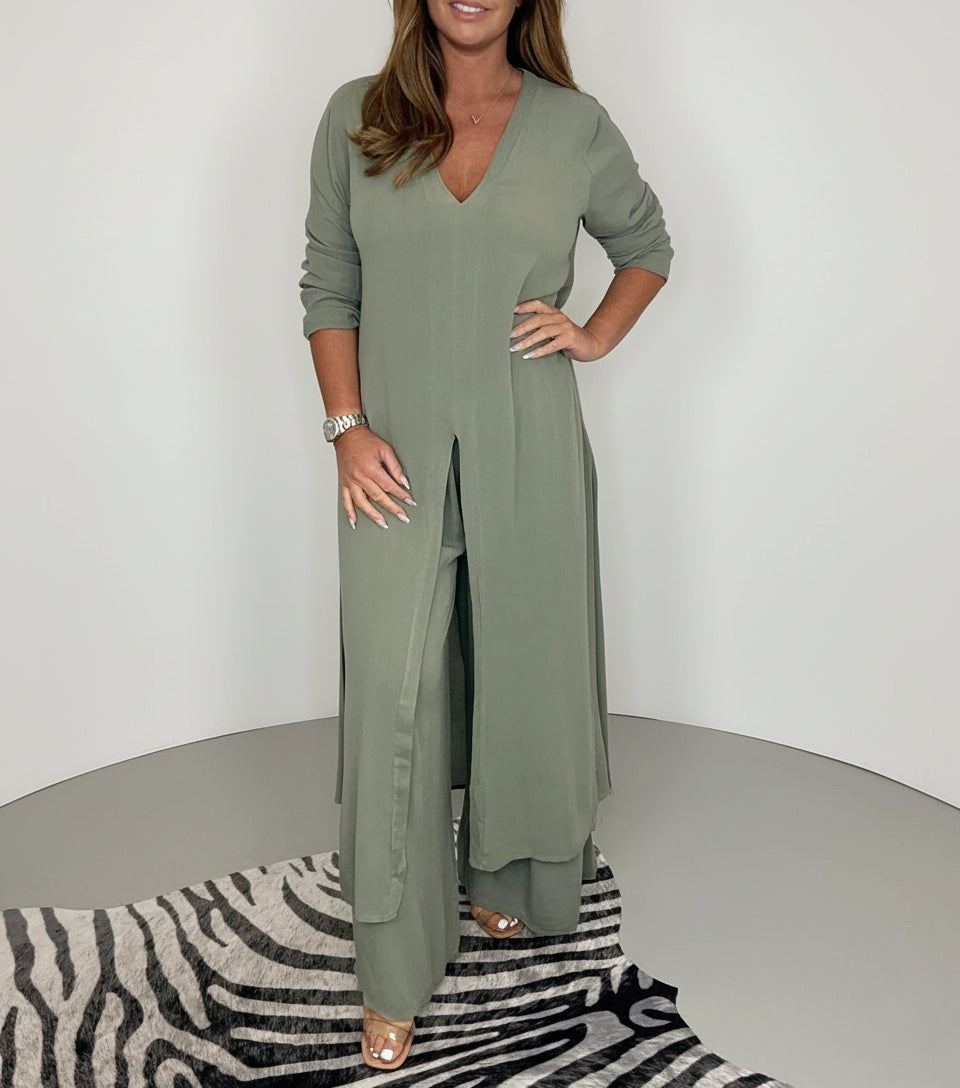 • Καθημερινό Στυλ: Η μακριά μπλούζα προσθέτει μια πινελιά κομψότητας, ενώ το αέρινο παντελόνι επιτρέπει μέγιστη ελευθερία κινήσεων.